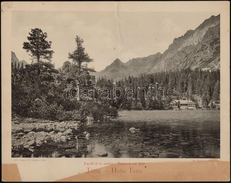 1898 Magas-Tátra, Poprádi-tó és menedékház, fotónyomat, Stengel & Co., karton, foltos, középen hajtás nyommal, a hátoldalán ajándékozási sorokkal, 24x30,5 cm. / 1898 High Tátra Popradské Lake, and rest house, damaged, spotty, 24x30,5 cm.