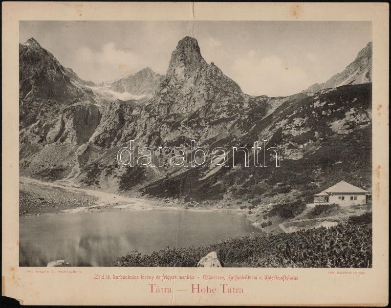 1898 Tátra, Zöld-tó, Karbunkulus torony Frigyes menház, fotónyomat, Stengel & Co., karton, sérült, kis hiánnyal az egyik sarkánál, középen a hajtásnyommal és töréssel, a hátoldalán ajándékozási sorokkal, . 24x30,5 cm. / High Tatra, Green lake and rest house, damaged, 24x30,5 cm.