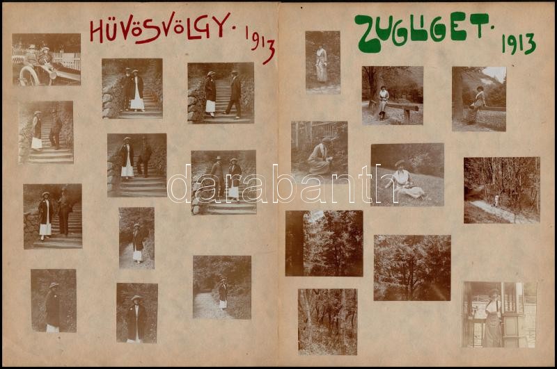 1913-1916 Budapesti hangulat: "Very" drogéria, Városliget, Margitsziget, ügető, Zugliget, Aquincum, Hűvösvölgy, összesen 64 db, lapokra ragasztva, különböző méretben