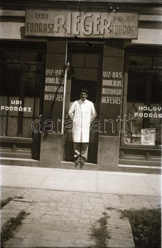 Beschreibung: Rieger Úri és Hölgy fodrász üzlete előtt, fotónegatív, 9x6 cm