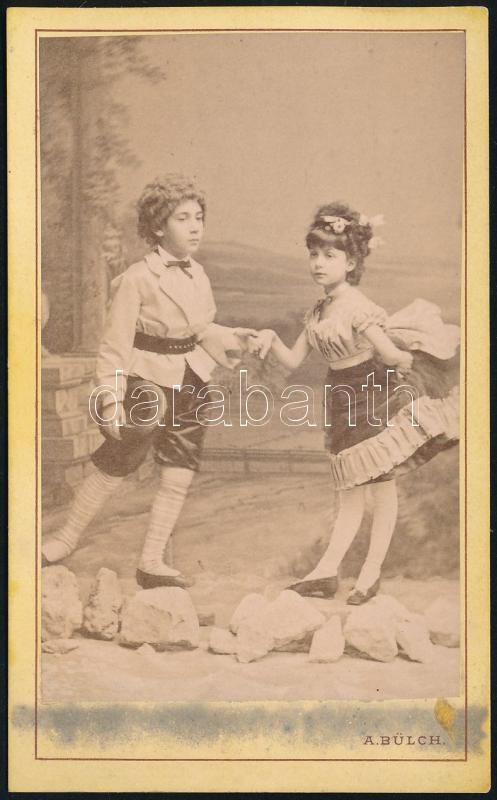 Beschreibung: cca 1870 Színjátszók, keményhátú fotó Bülch Ágoston pesti műterméből, 10,5×6,5 cm