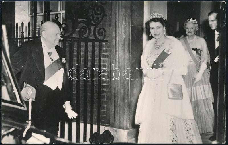cca 1952 Churchill miniszterelnök, II. Erzsébet királynő és I. Erzsébet anyakirálynő, vintage fotó, 9x14 cm / Elizabeth II and Churchill, photo, 9x14 cm
