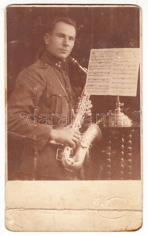 cca 1930 Katona szaxofonnal, fotólap, törésnyommal, 14×9 cm https://www.darabanth.com/de/307-Fernauktion/307.0/Andere-Sammelgebiete/Militaria~500019/cca-1930-Katona-szaxofonnal-fotolap-toresnyommal-14C3979-cm~II1666089