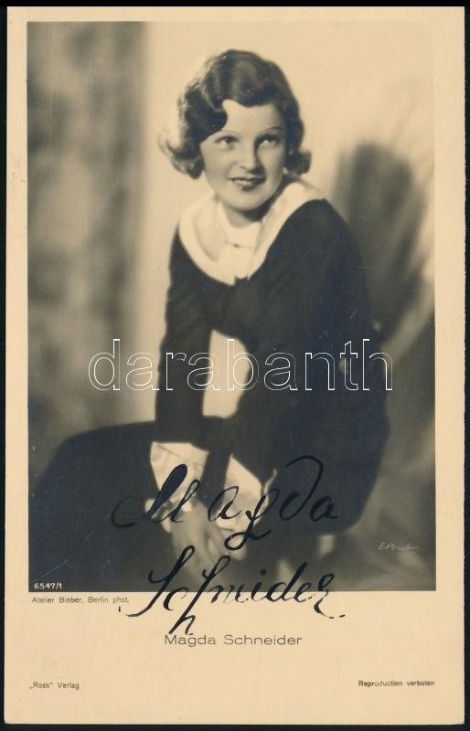 Magda Schneider (1909-1996) német színésznő aláírása őt ábrázoló fotó... https://www.darabanth.com/de/307-Fernauktion/307.0/Andere-Sammelgebiete/Signatur~19/Magda-Schneider-1909-1996-nemet-szineszno-alairasa-ot-abrazolo-fotolapon-autograph-~II1664058