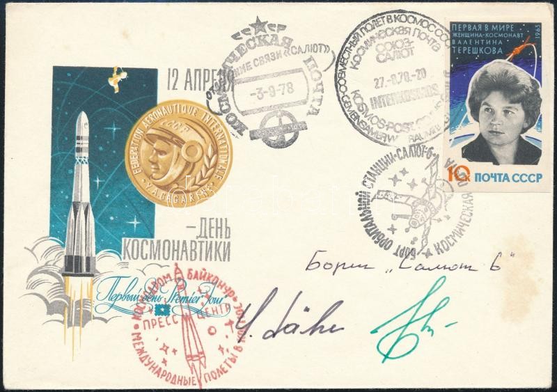Valerij Bikovszkij (1934- ) szovjet és Sigmund Jähn (1937- ) német űrhajósok aláírásai emlékborítékon /