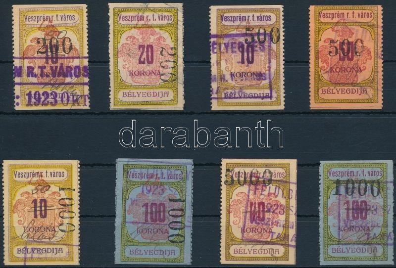 Beschreibung: 1923-24 Veszprém városi illetékbélyegek többszörösen átértékelve 42-43 + 45 + 47 + 49-50 + 54 + 63 sz. (49.500)
