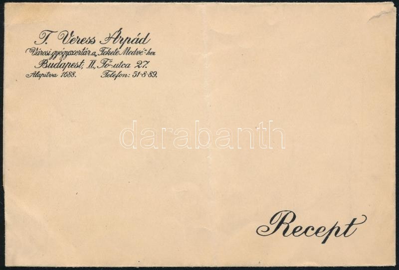 Beschreibung: T. Veress Árpád Városi Gyógyszertára a "Fekete Medve"-hez receptborítéka (Budapest II., Fő utca)