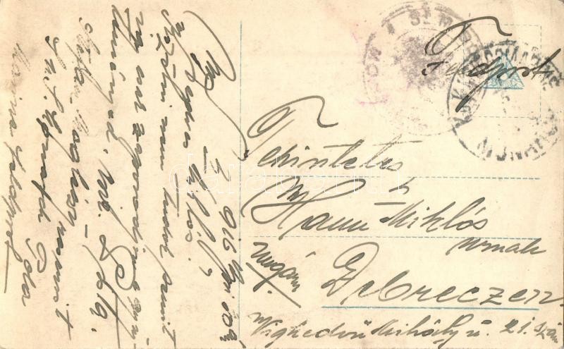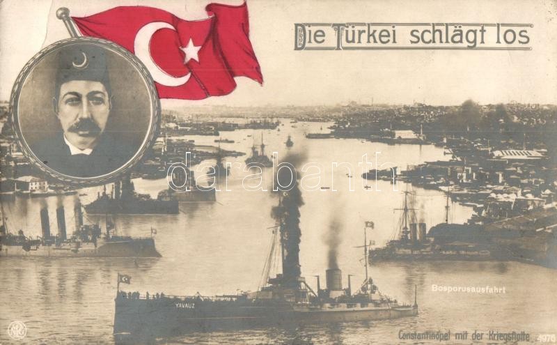 Die Türkei schlägt los. Bosporusausfahrt, Constantinopel mit der Kriegsflotte / Török hadiflotta Konstantinápolyban, Yavuz csatacirkáló / WWI The Ottoman Navy at the Golden Horn in Constantinople, Yavuz (ex-SMS Goeben) battlecruiser, Mehmed V Ottoman Sultan, Turkish flag + SMS Monarch (EB)