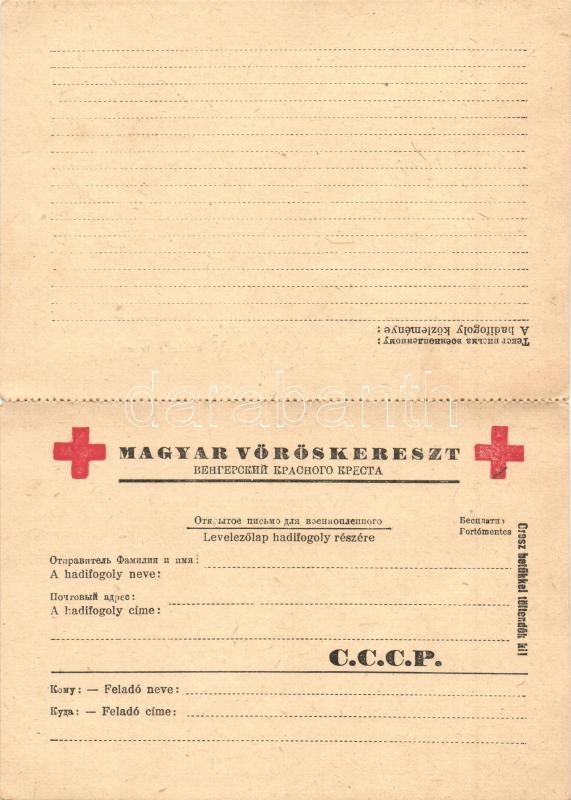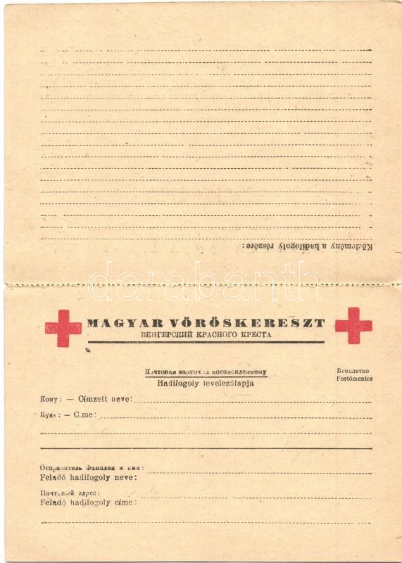 A Magyar Vöröskereszt magyar-orosz kétnyelvű Levelezőlapja Hadifoglyok részére. kinyitható / Hungarian Red Cross's Russo-Hungarian language postcard for War Prisoners, folding card