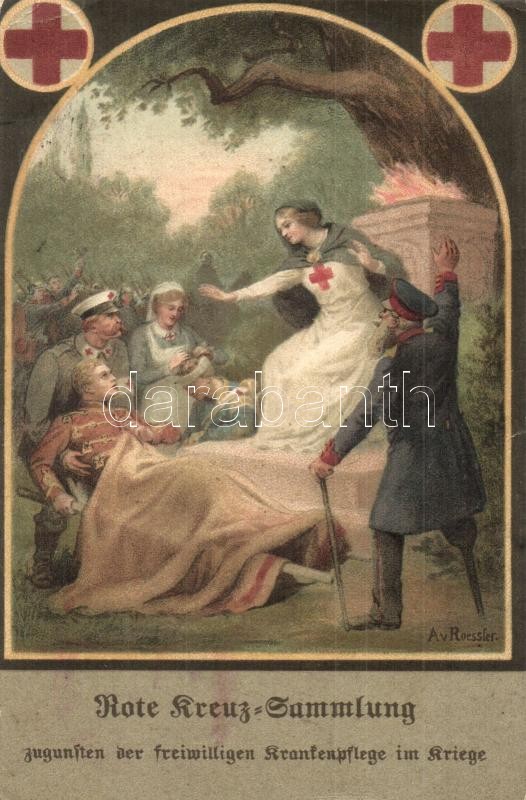 Beschreibung: Rote Kreuz Sammlung zugunsten der freiwilligen Krankenpflege im Kriege / WWI K.u.k. military Red Cross art postcard, litho s: A.v. Roessler (EK)