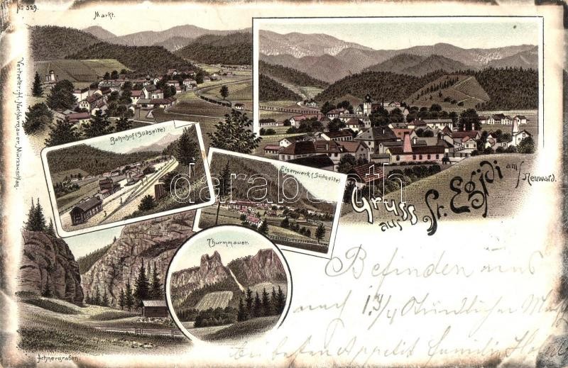 1895 (Vorläufer!) Sankt Aegyd am Neuwalde, St. Egid; Markt, Eisenwerk, Bahnhof, Thurmmauer / square, iron works, railway station. H. Nachbargauer litho (EK)