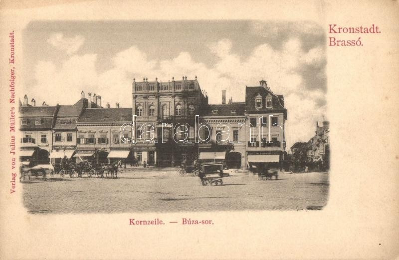 Brassó, Kronstadt, Brasov; Búza sor, Schutzerger gyógyszertár, Szentpétery M., H. Zeidner és Jacob L. Adler és fiai üzlete / Kornzeile / square with shops