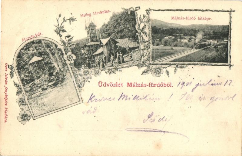 Beschreibung: Málnásfürdő, Malnas Bai; Margit kút, Hideg Herkules. Gere István kiadása / spa, well, villa. floral Art Nouveau (EK)