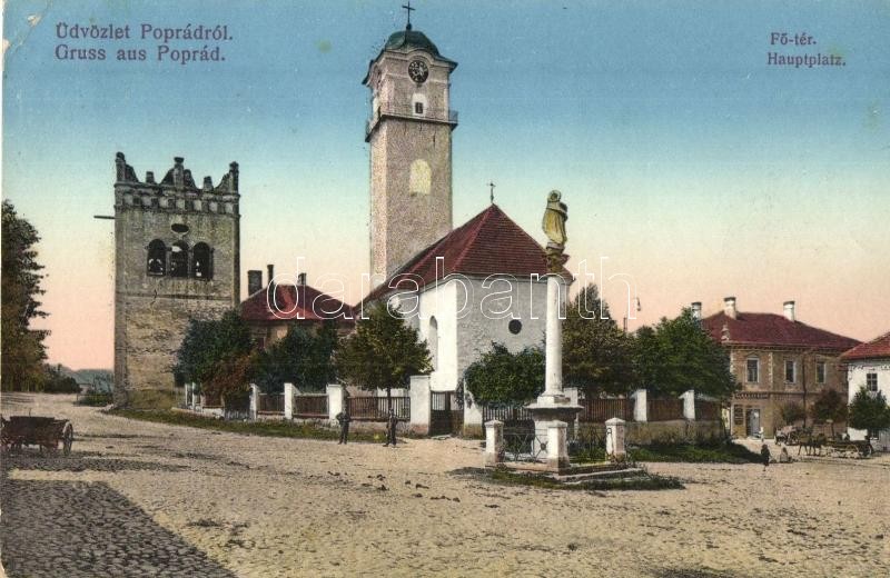 Beschreibung: Poprád (Tátra), Fő tér, templom, Galló Ede üzlete / main square, church, shops (EK)