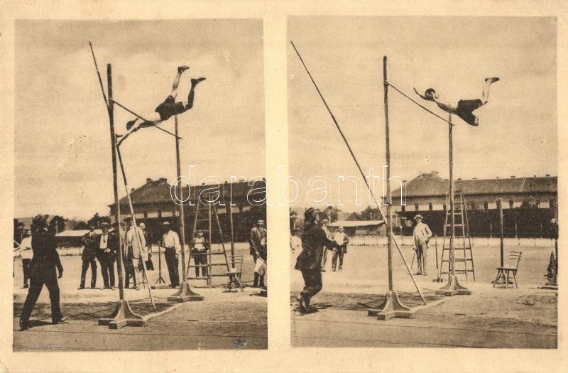 Beschreibung: 1912 MAC verseny, Szathmáry rúdugrása; kiadja 'Klasszikus pillanatok vállalata' 4. sz. / Hungarian high jump championship (EK)