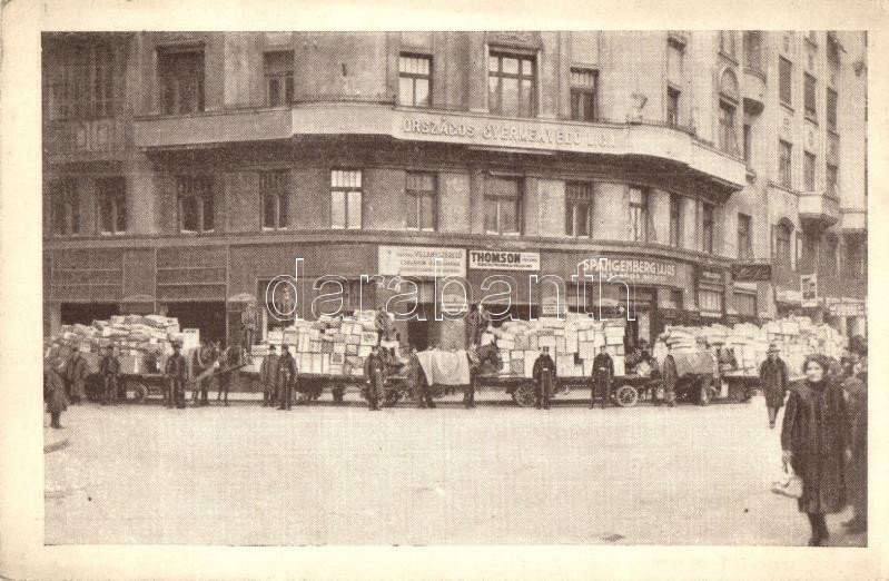 Budapest VII. Országos Gyermekvédő Liga központi irodája, Külföldi szeretetadományokkal telt, lerakodásra való társzekerek, Spangenberg Lajos kalapos üzlete, Thomson villanyszerelő (EK)
