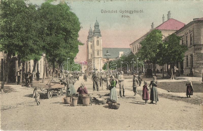 Beschreibung: Gyöngyös, Fő tér, piac, árusok, Hotel Bruckner szálloda és étterem. Steinitz Gábor kiadása (kis szakadás / small tear)