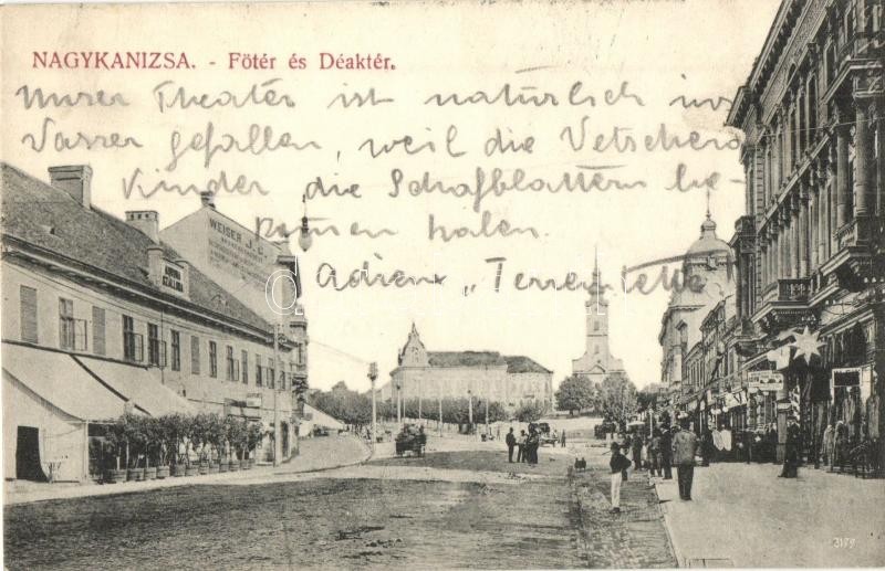 Beschreibung: Nagykanizsa, Fő tér, Deák tér, Korona szálloda, üzletek, Weiser J. vas kereskedése. Fischel Fülöp fia kiadása (EK)