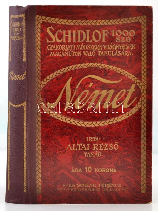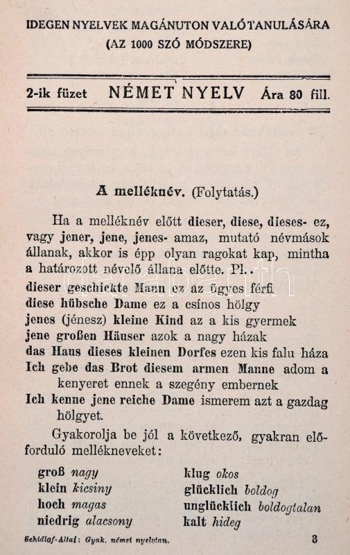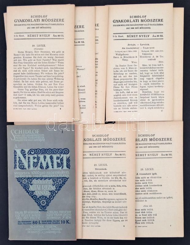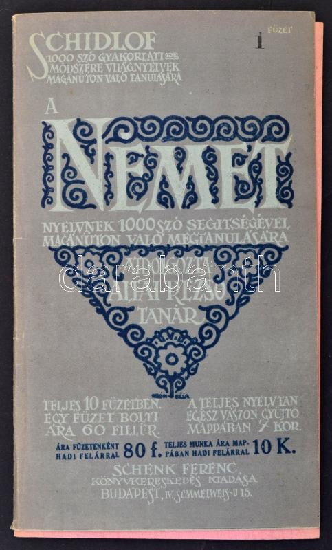 Altai Rezső: Schidlof gyakorlati módszere világnyelvek magánúton való tanlására. Az 1000 szó módszere. Német nyelv - 1-10 füzet. Bp., é.n. (cca 1910), Schenk Ferenc. Kiadói félvászon mappában, az egyik behajtón kis szakadással, jó állapotban.
