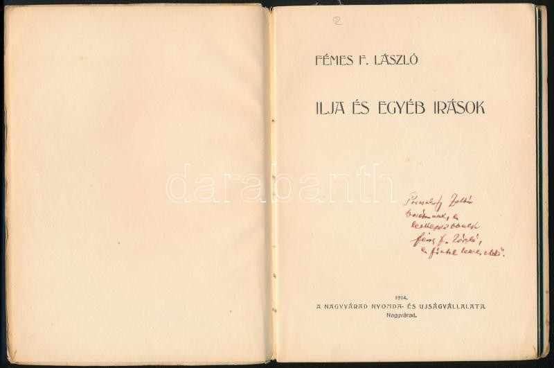Fémes F. László: Ilja és egyéb írások. Nagyvárad, 1914, Nagyvárad Nyom... https://www.darabanth.com/de/307-Fernauktion/307.0/Bucher/Bucher-Andere-kuriositaten~500016/Femes-F-Laszlo-Ilja-es-egyeb-irasok-Nagyvarad-1914-Nagyvarad-Nyomda-es-Ujsagvalla~II1659068