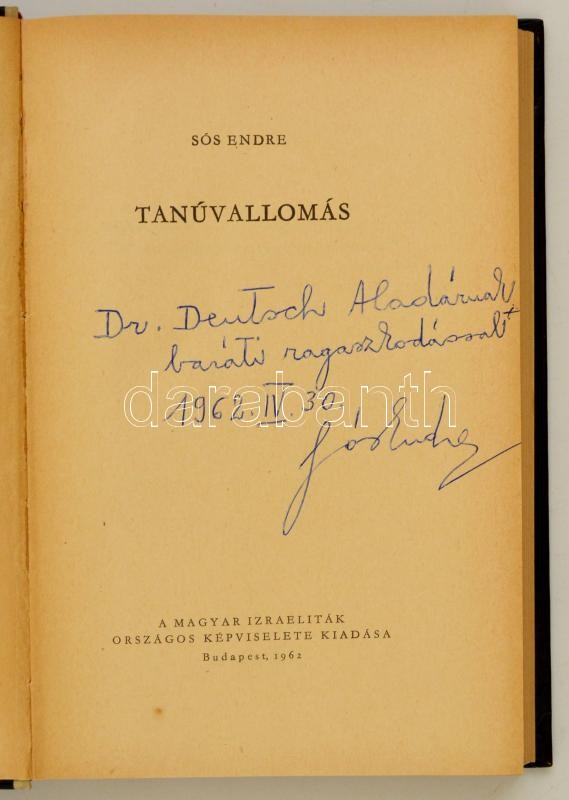 Sós Endre: Tanúvallomás. Bp.,1962, Magyar Izraeliták Országos Képviselte. Kiadói félvászon-kötés. A szerző által dedikált Deutsch Aladár (1899-1973) főorvosnak.