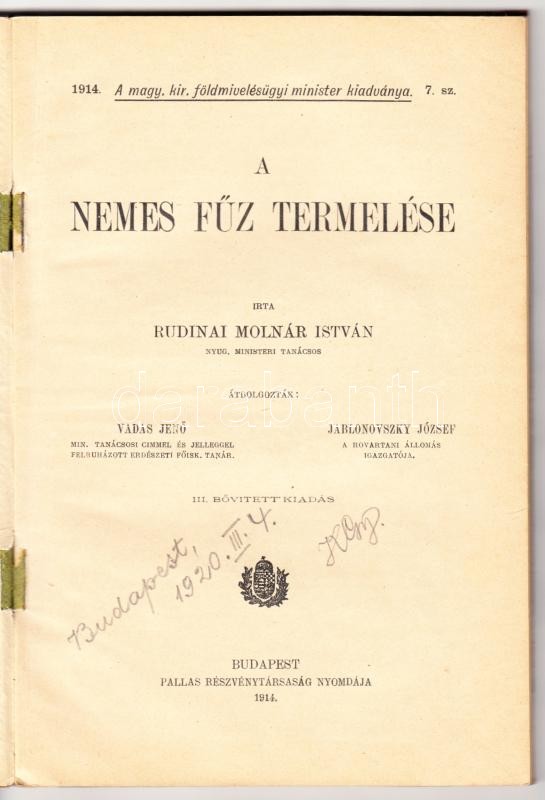 Rudinai Molnár István-Vadas Jenő-Jablonovszky József: A nemes fűz term... https://www.darabanth.com/de/307-Fernauktion/307.0/Bucher/Bucher-Gastronomie-und-Gartnerei~500007/Rudinai-Molnar-Istvan-Vadas-Jeno-Jablonovszky-Jozsef-A-nemes-fuz-termelese-A-magy-kir-fol~II1664903