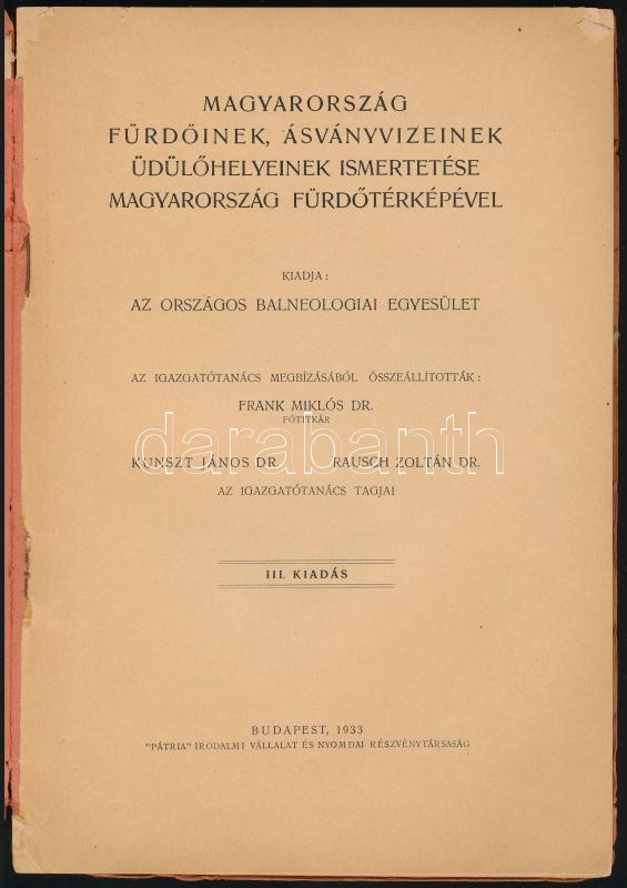 Frank-Kunszt-Rausch: Magyarország fürdőinek, ásványvizeinek, üdülőhelyeinek ismertetése Magyarország fürdőtérképével. Bp., 1933, Pátria. Kiadói papírkötés, gerincnél szakadt, kissé kopottas állapotban.