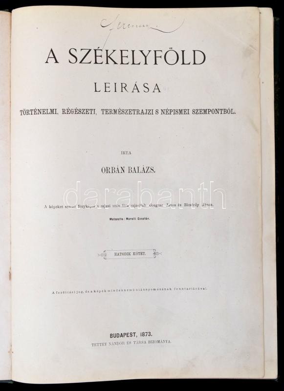 Orbán Balázs: A székelyföld leírása történelmi, régészeti, természetrajzi s népismei szempontból. VI. kötet: Barczaság. Bp.,1873, Tettey Nándor és Társa, Pesti Könyvnyomda Rt., 4+448 p. + 8 t. Szövegközti fametszetű képekkel, melyeket a szerző fényképei alapján a kor neves rajzolói készítettek. Átkötött félvászon-kötés, kissé kopottas borítóval, egy-két foltos lapszéllel, egy tábla részben kijár, egy tábla hiányzik.
