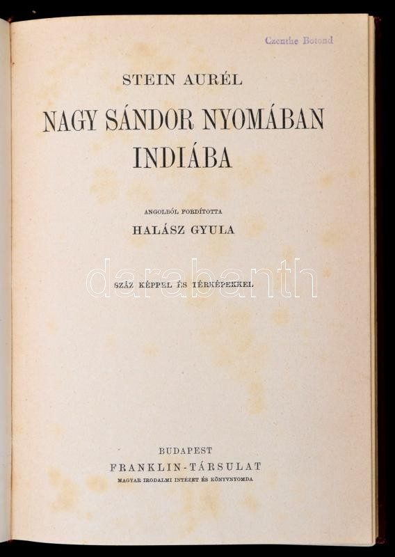 Stein Aurél: Nagy Sándor nyomában Indiába. Bp., é. n., Franklin (A Magyar Földrajzi Társaság Könyvtára). Kicsit kopott, díszes vászonkötésben, az elején enyhén foltos lapokkal