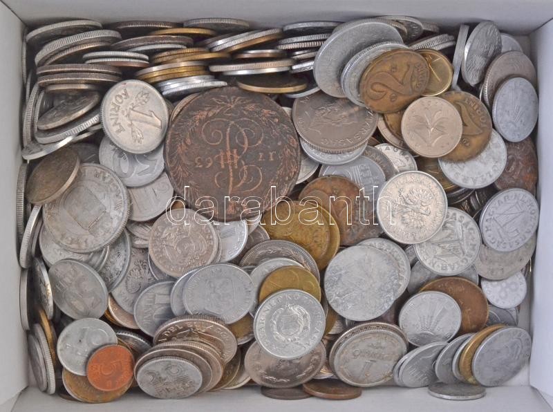 Vegyes fémpénz tétel a világ minden tájáról közte több Ecuador-i érme, ~1,4kg súlyban, közte: Orosz Birodalom 1763. 5k Cu, Magyarország 1948. 50f Al, Románia 1942. 200L Ag, Svédország 1943. 10ö Ag T:vegyes Mixed: coin lot from all around the World with some coins from Ecuador in ~1,4kg net weight, including: Russian Empire 1763. 5 Kopek Cu, Hungary 1948. 50 Fillér Al, Romania 1942. 200 Lei Ag, Sweden 1943. 10 Öre Ag C:mixed