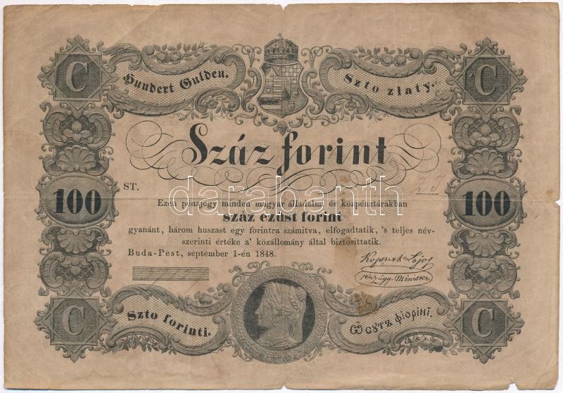 Hungary 1848. 100Ft &quo... https://www.darabanth.com/de/307-Fernauktion/307.0/Numismatik/Ungarische-Banknoten~300007/1848-100Ft-Kossuth-banko-TIII---Hungary-1848-100Ft-Kossuth-banknote-CVG--Adamo-G114~II1663692