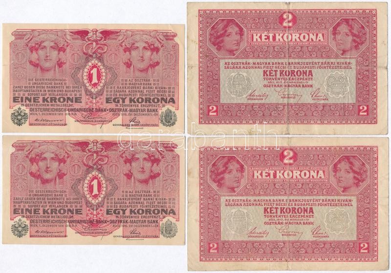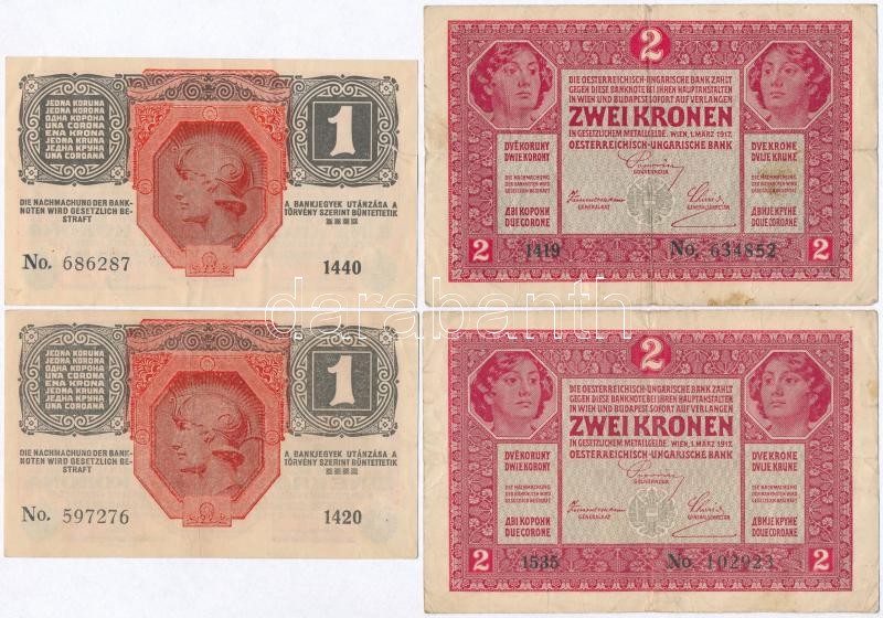 1916. 1K (2x) + 1917. 2K (2x) T:III közte szép papír https://www.darabanth.com/de/307-Fernauktion/307.0/Numismatik/Ungarische-Banknoten~300007/1916-1K-2x-plus-1917-2K-2x-TIII-kozte-szep-papir~II1635688