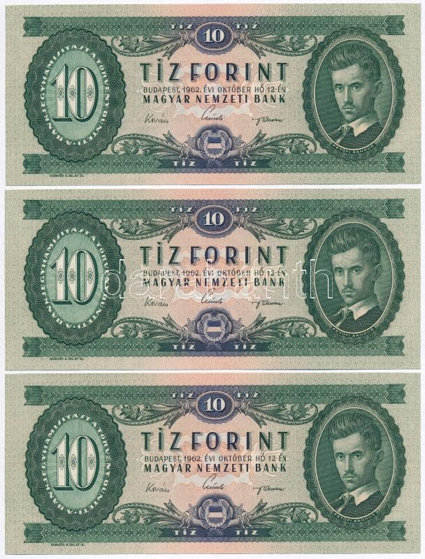 1962. 10Ft (3x) sorszámkövetők T:I https://www.darabanth.com/de/307-Fernauktion/307.0/Numismatik/Ungarische-Banknoten~300007/1962-10Ft-3x-sorszamkovetok-TI~II1663502