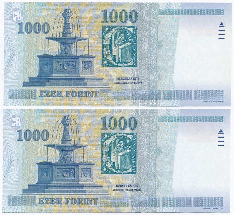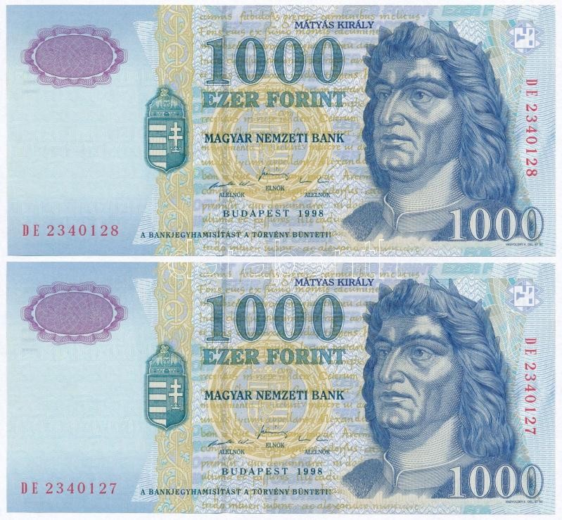 1998. 1000Ft (2x) sorszámkövetők, "DE" betűjel T:I https://www.darabanth.com/de/307-Fernauktion/307.0/Numismatik/Ungarische-Banknoten~300007/1998-1000Ft-2x-sorszamkovetok-DE-betujel-TI~II1663544