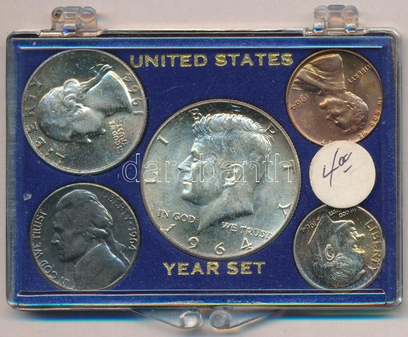 Amerikai Egyesült Államok 1964. 1c Br "Lincoln" + 5c Cu-Ni "Jefferson" + 1D Ag "Roosevelt" + 1/4$ Ag "Washington" + 1/2$ Ag "Kennedy" kis műanyag tokban T:1-