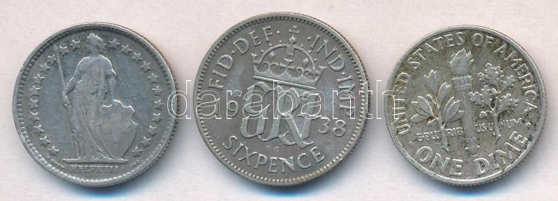 Switzerland 1920B 1/2 Francs Ag + Great Britain 1938. 6 Pence Ag "George VI" + USA 1964. 1 Dime Ag "Roosevelt" C:XF,VF