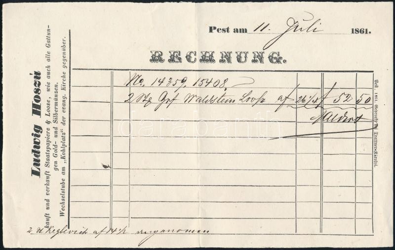 1861 Ludwig Hosszú fejléces számla, német nyelven, 13,5x21,5 cm https://www.darabanth.com/de/308-Fernauktion/308.0/Andere-Sammelgebiete/Dokument~16/1861-Ludwig-Hosszu-fejleces-szamla-nemet-nyelven-13-5x21-5-cm~II1675269