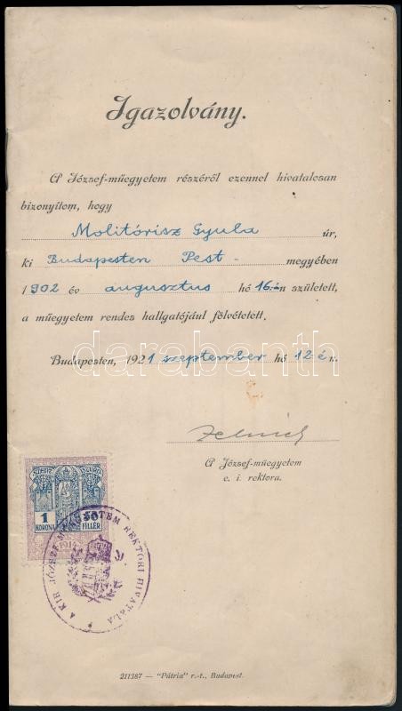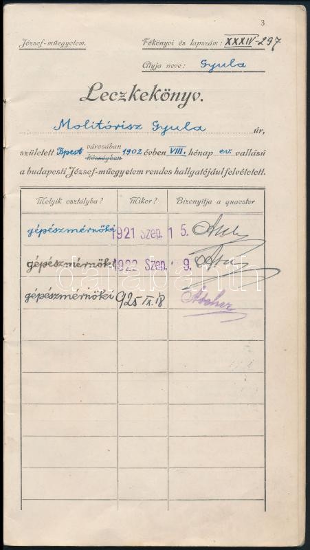 1921-1926 A budapesti Kir. József Műegyetem leckekkönyve Molitórisz Gyula (1902-1959) gépészmérnök részére. Az egyetem rektorának, dékánjának, és tanárainak aláírásaival, okmánybélyegekkel (4 db 1kr. 50f., 2 db 5kr., 1 db 1000kr.) pecséttekkel. Az egészvászon-kötés hiányzik.
