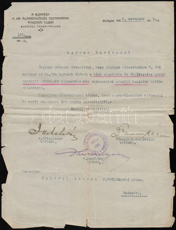 1925 A Bp-i M. kir. Államrendőrság tisztikarának Athlétikai Clubja eli... https://www.darabanth.com/de/308-Fernauktion/308.0/Andere-Sammelgebiete/Dokument~16/1925-A-Bp-i-M-kir-Allamrendorsag-tisztikaranak-Athletikai-Clubja-elismero-oklevele-rendor-k~II1669508