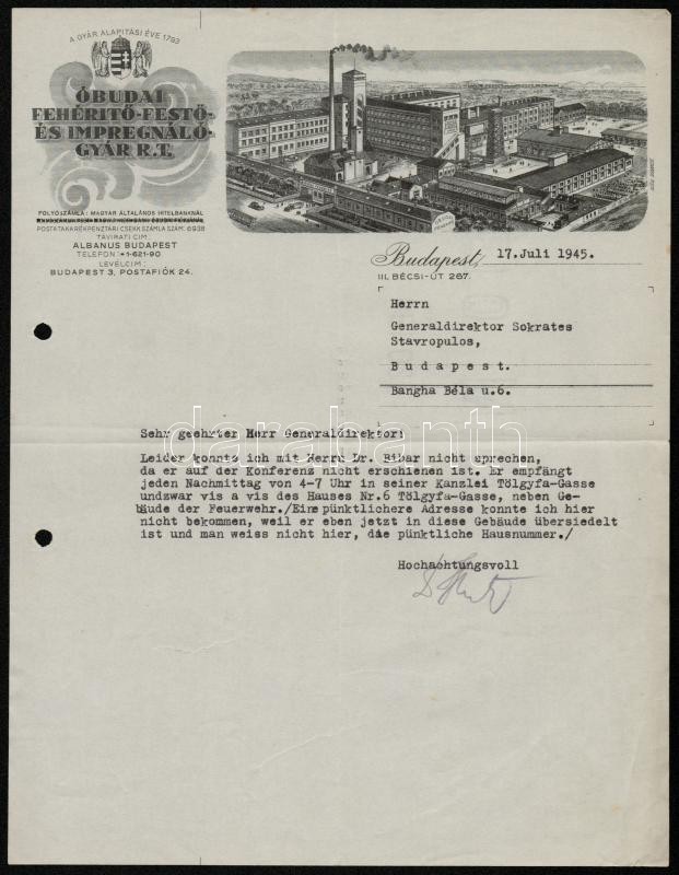 1945 Óbudai Fehérítő Festő és Impregnáló Gyár Rt. díszes fejléces levé... https://www.darabanth.com/de/308-Fernauktion/308.0/Andere-Sammelgebiete/Dokument~16/1945-Obudai-Feherito-Festo-es-Impregnalo-Gyar-Rt-diszes-fejleces-level-nemet-nyelven-~II1674923