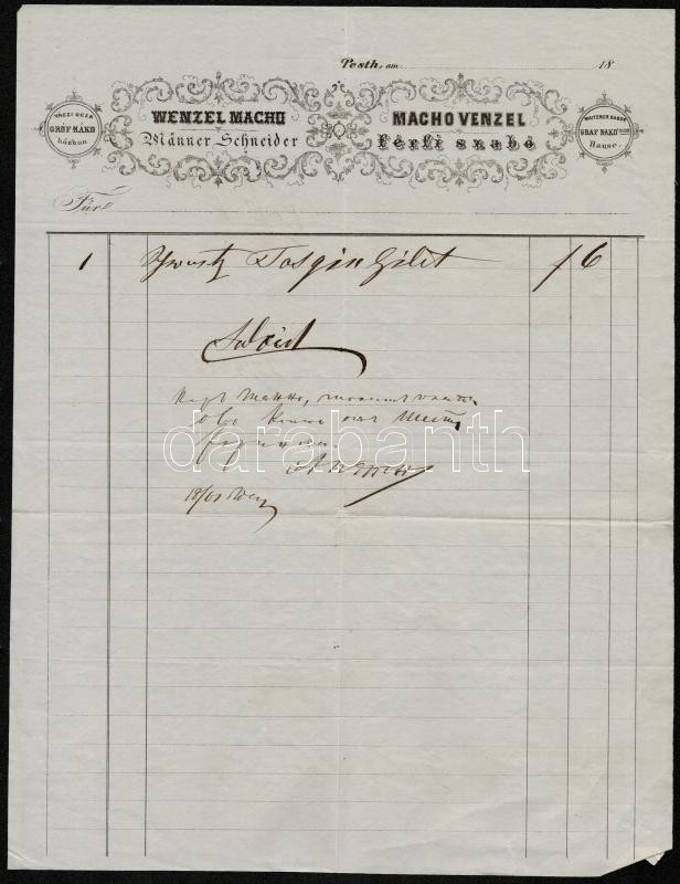 cca 1860 Macho Venzel férfi szabó díszes fejléces számla, német nyelve... https://www.darabanth.com/de/308-Fernauktion/308.0/Andere-Sammelgebiete/Dokument~16/cca-1860-Macho-Venzel-ferfi-szabo-diszes-fejleces-szamla-nemet-nyelven-29-5x23-cm~II1675276