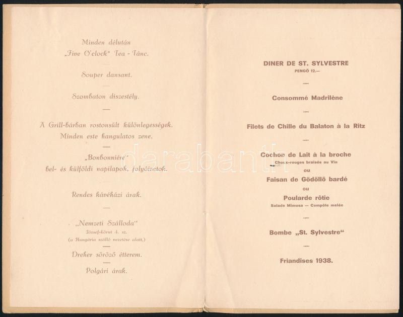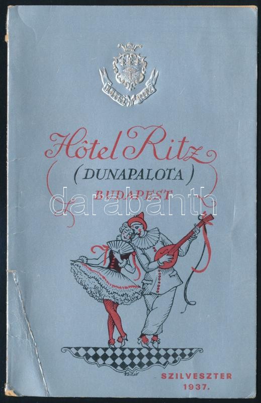 1937 Biczó András (1888-1957): Hotel Ritz Dunapalota Budapest illusztrált szilveszteri menükártya, mappa benne menülappal, magyar és francia nyelven, kissé gyűrött sarokkal,19x12 cm.
