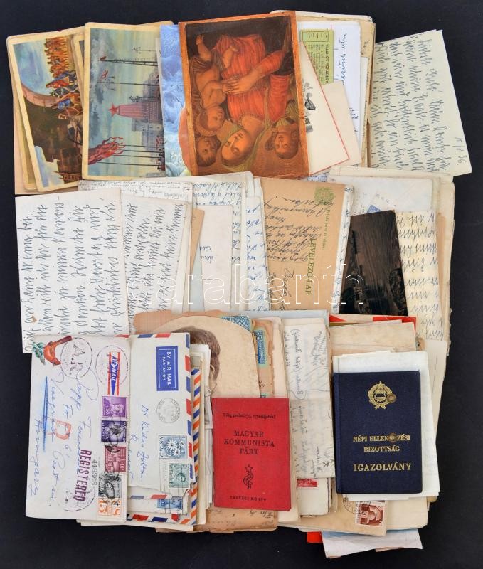 Beschreibung: Vegyes papírrégiség tétel: Légiposta, levelek, számlák, okmányok, filatélia, csokipapírok, bizonyítványok, némi judaika, fotó képeslap tábori posta.