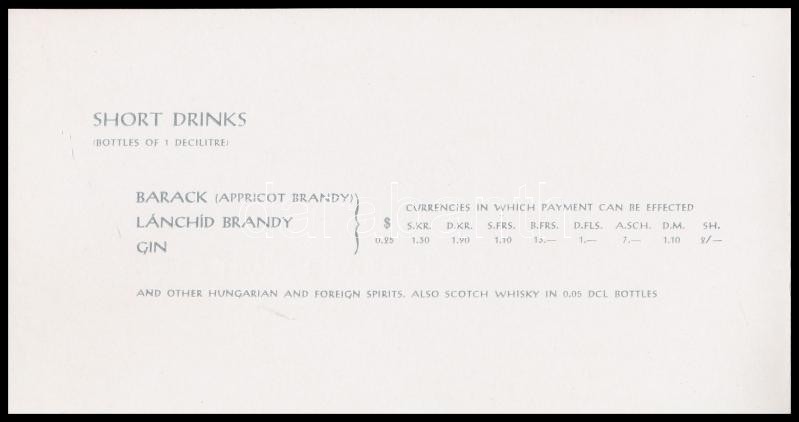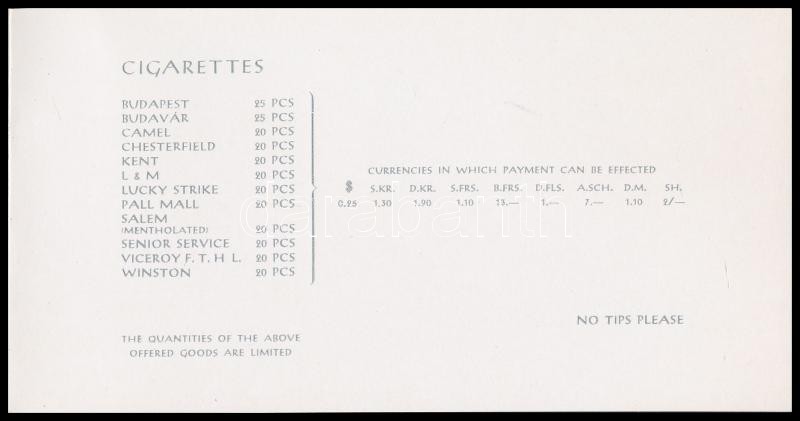 Beschreibung: cca 1970 a Malév angol nyelvű cigaretta- és italár-jegyzéke