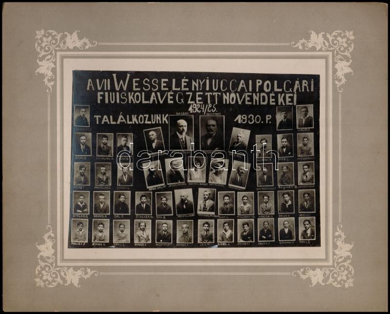 1925 Budapest, VII. ker., Wesselényi utcai polgári fiúiskola tanárai és végzett növendékei, kistabló 48 db nevesített portréval, 14x20 cm, karton 25x31 cm