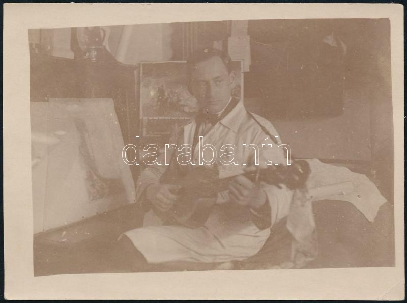 Beschreibung: 1926 Drahos István (1895-1968) festőművészről gitározás közben készített fotó, hátoldalon a művész saját kezű dedikációjával, 9x12 cm