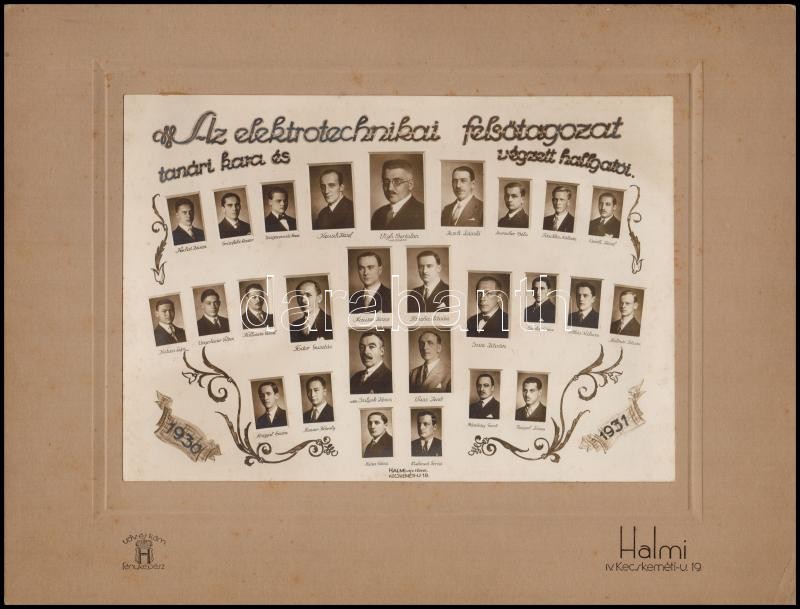 Beschreibung: 1931 Budapest, az Elektrotechnikai felsőtagozat tanári kara és végzett hallgatói, kistabló 27 db nevesített portréval, 16x22,5 cm, karton 25x33 cm