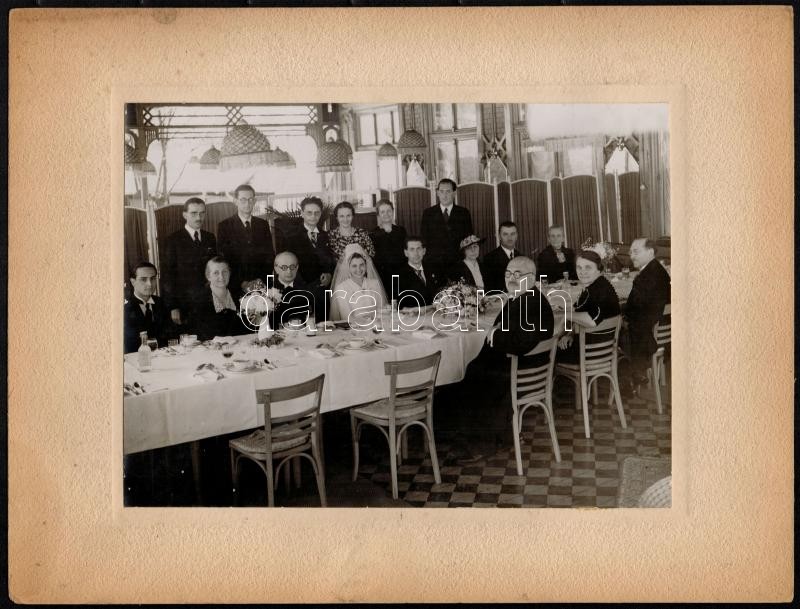 1938 Bp., Szentágothai János (szül. Schimert, 1912-1994) MTA elnök, anatómus esküvői ebédjén, a Gundel étteremben készült fotó, rajta ismert tudósokkal (pl. Kiss Ferenc), pecséttel jelzett (Beller Rezső), kartonra kasírozott, feliratozott fotó, 17x23 cm