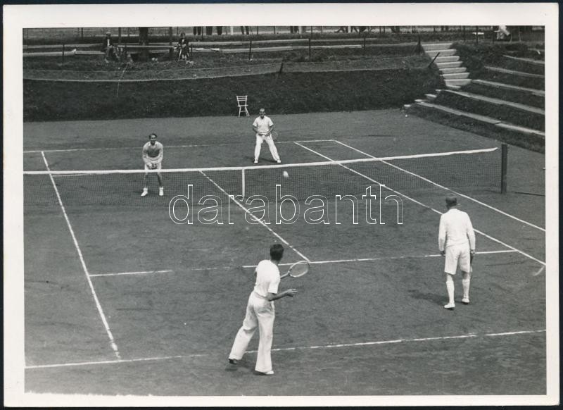 Beschreibung: Teniszmérkőzés, Henkel-Denker és Gábori-Ferenczi, Magyar Film Iroda pecséttel jelzett, feliratozott fotója, 13x18 cm