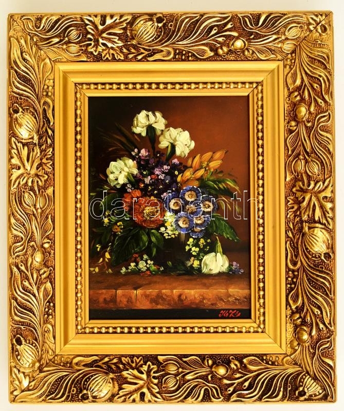 Beschreibung: K.Zs jelzéssel: Virágcsendélet. Olaj, falemez, újszerű keretben, 18×13 cm